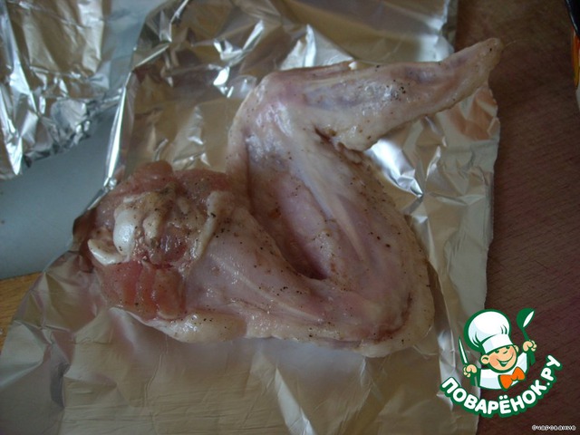 Каждое крылышко завернуть в фольгу и запечь до полуготовности.
