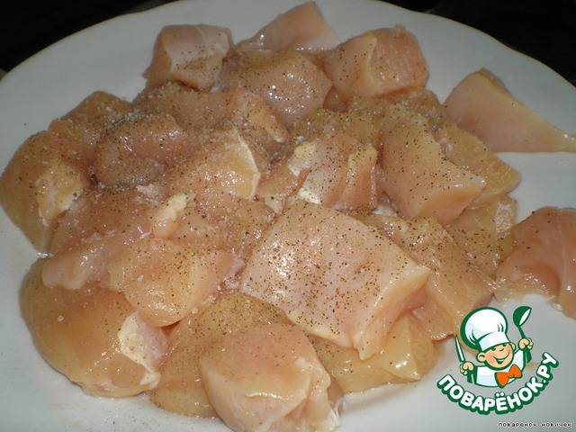 Куриное филе помыть и порезать на квадратики, порезанное филе посолить и поперчить.