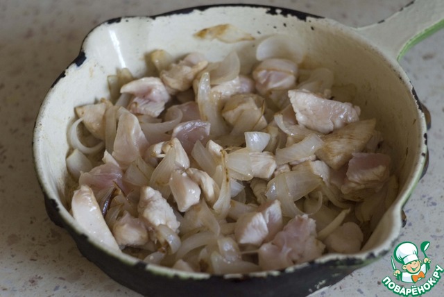 На среднем огне обжарьте лук до золотистого цвета. Добавьте куриное филе и обжарьте, помешивая, в течение 3 минут.