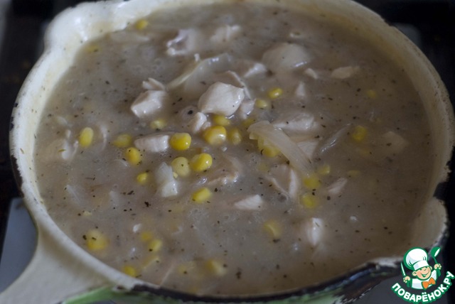 Проварите, помешивая до загустения. Добавьте тимьян и посолите по вкусу. Добавьте кукурузу и варите еще несколько минут. В конце добавьте сметану, размешайте и снимите с огня.