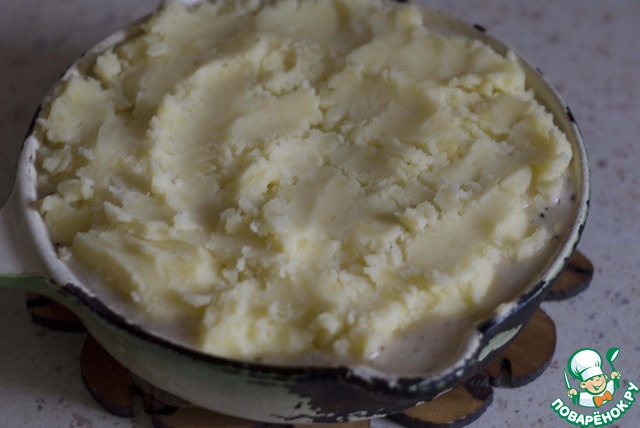 Сверху выложить слой толченого картофеля и поставить в разогретую до максимума духовку на 5 минут, или под гриль.