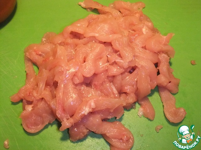 Филе режем тоненькой соломкой ( удобнее, когда филе подморожено)