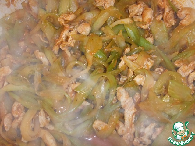 Добавляем филе, обжариваем 1-2 минуты, постоянно перемешивая