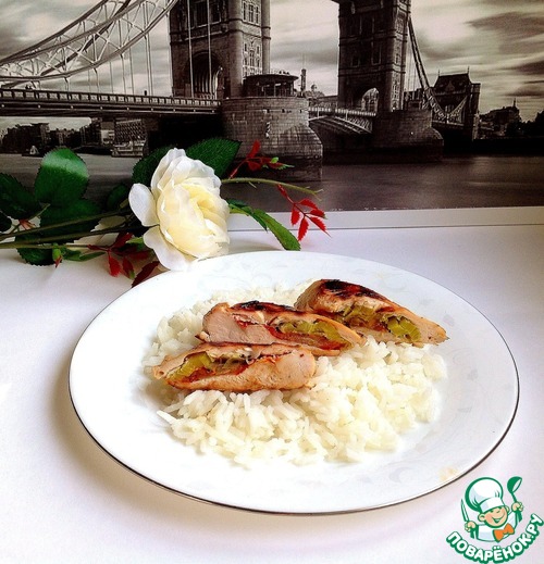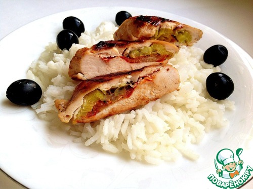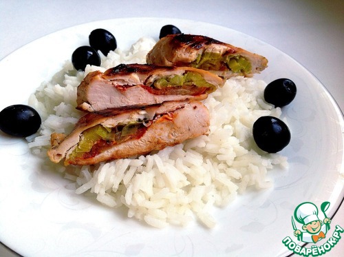 Из готовой грудки вынимаем зубочистки, режем на порционные кусочки и подаем с рисом.
