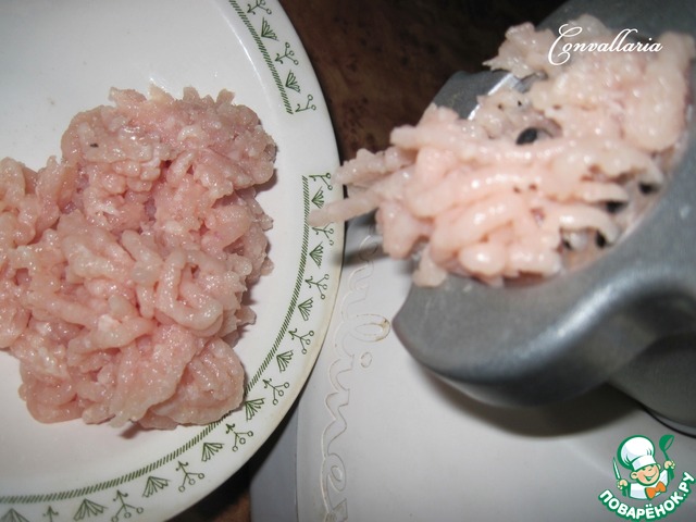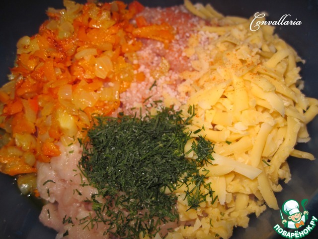 К куриному фаршу добавить мелко нарезанную зелень, обжаренные овощи и сыр, натертый на крупной терке. Посолить, поперчить и хорошо вымесить фарш.