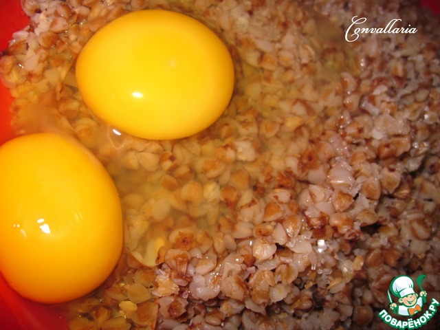 К остывшей гречневой крупе добавить яйца, соль и хорошо перемешать.