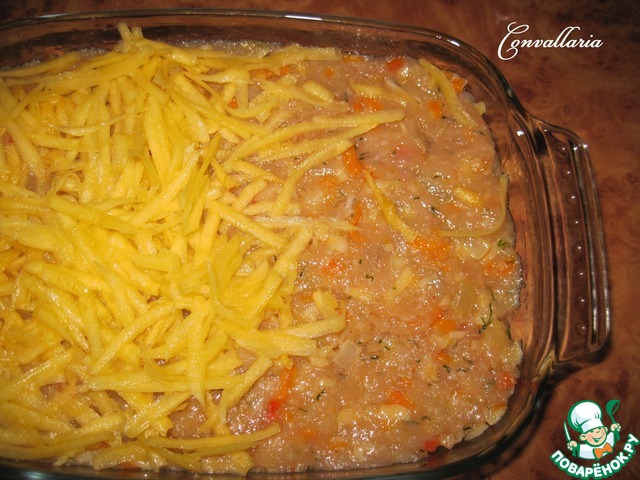 Затем идет слой фарша с овощами и опять слой оставшейся тыквы.