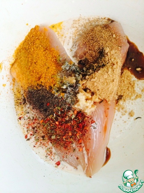 Добавляем специи, давленный чеснок, соевый соус, сливки, сок лимона. Поставим в холодильник мариноваться на 20 минут (можно дольше, вкус только выиграет)