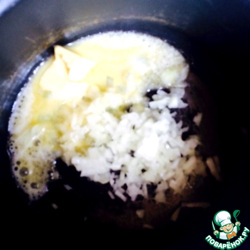 В маленькой кастрюльке растопите кусочек сливочного масла и обжарьте мелко порезанный лук с сушеной зеленью (1 мин).
