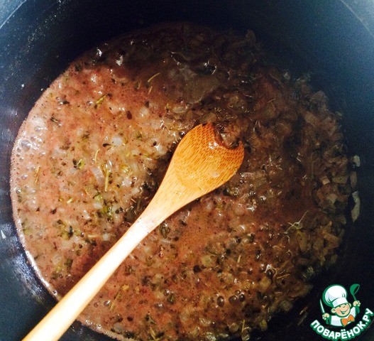 Влейте красное сухое вино. Проварите несколько минут (3-5), вино немного выпариться.