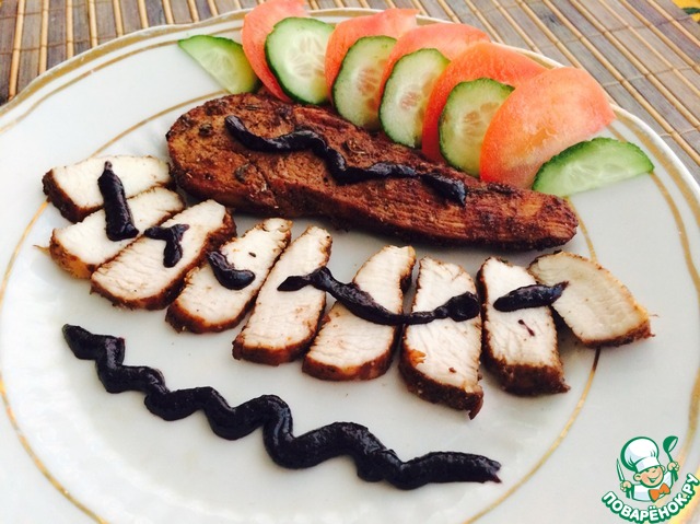 | Удивлены наличием какао? Ну, а на самом деле, какао не дает какого-то экзотического вкуса, зато благодаря ему сочная курочка приобретает легчайший, едва ощутимый пряный аромат и замечательную румяную корочку. Ну а черничный соус... Черничный соус - это причина № 1, почему нужно приготовить это вкуснейшее блюдо! |