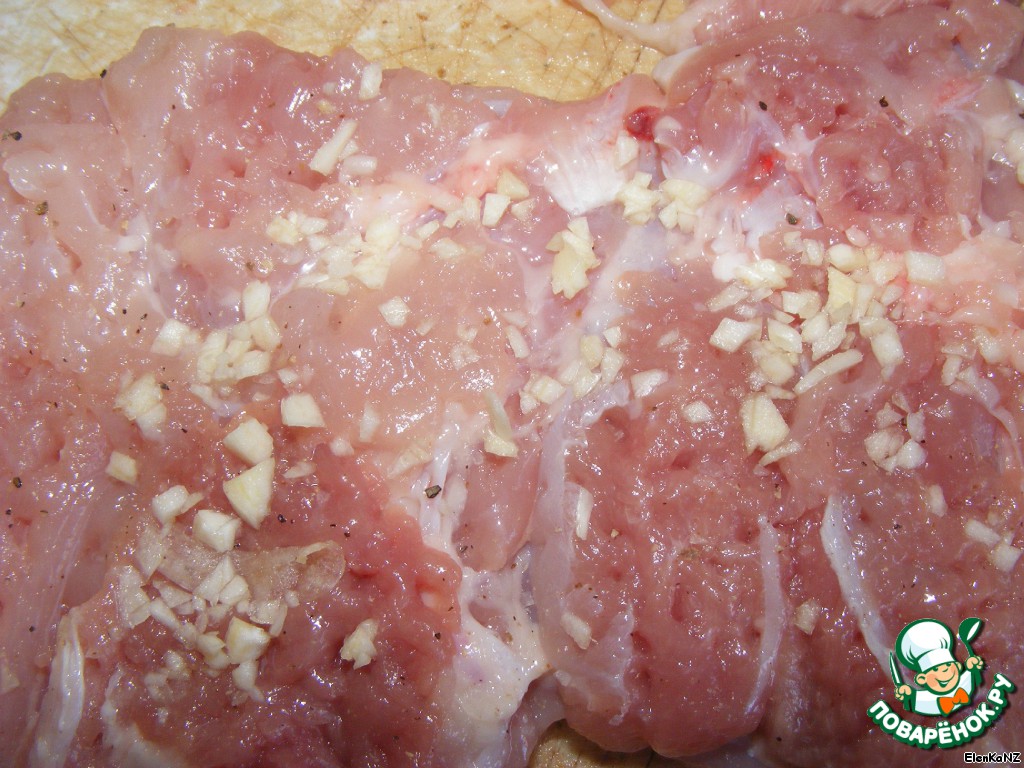 Куриную отбивную солим, перчим и натираем рубленым чесноком.