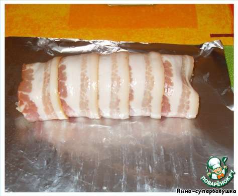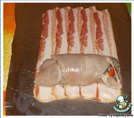 На кусочки фольги выложить несколько полосок бекона, слегка внахлест. На бекон положить свернутые рулетики.