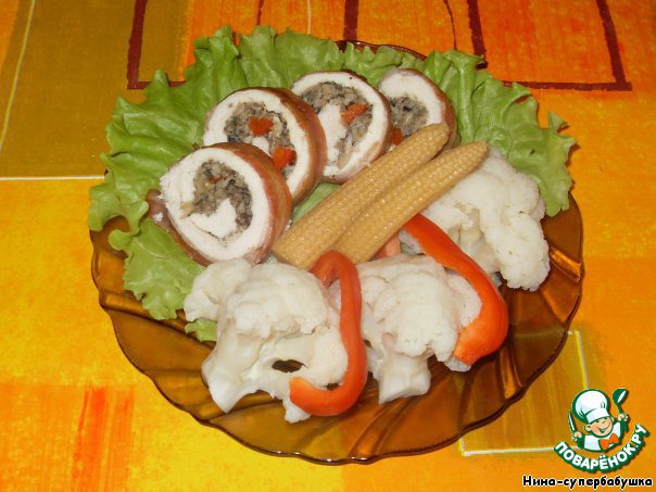 Куриное филе разрезать вдоль на две пластины. Поместить в полиэтиленовый пакет и отбить. Посолить, поперчить, можно посыпать приправой для курицы. Выложить грибную начинку (я использовала замороженные грибы, но можно взять и свежие шампиньоны или любые другие грибы, мелко нарезать их и обжарить с мелко нарезанным луком). Выложить начинку на филе, положить несколько полосок болгарского перца и свернуть рулетом.