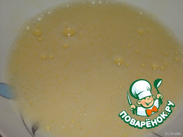 Яйца взбить с водой равной 2м яйцам.