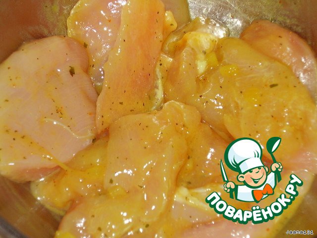Филе разрезать на порционные куски. Перемешать с маринадом.