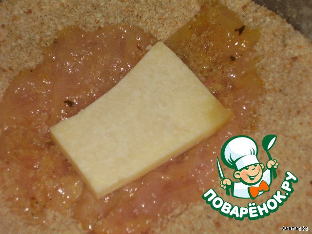 Филе положить в миску с панировочными сухарями. Сверху положить пласт сыра. Сыр намочить яйцом и перевернуть пласт. Аккуратно взять мясо и окунуть в яйцо и опять в панировку.