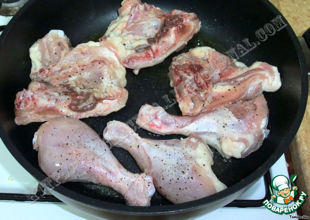 Окорочка (я брала окорочка без кожи) солим и перчим. Обжариваем окорочка с двух сторон по 3-4 минуты до образования золотой корочки. После обжарки, на время, достаем окорочка из кастрюли.