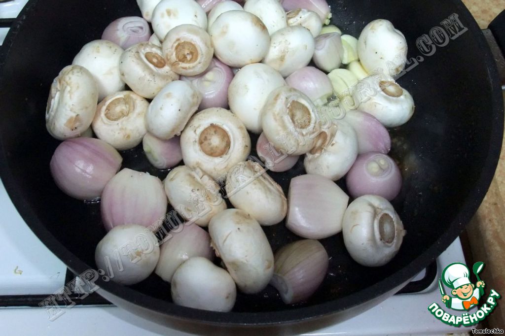 В эту же кастрюлю кладем чеснок разрезанный напополам, лук-шалот, целые грибы.