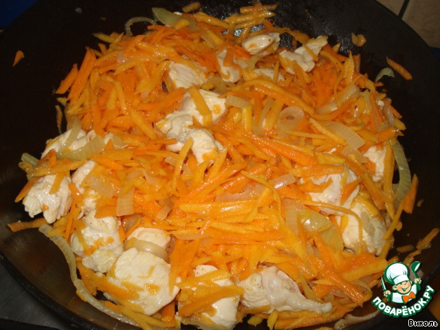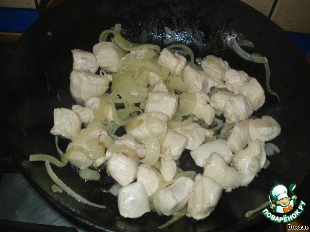 Луковицу нарезать полукольцами и слегка спассеровать в небольшом количестве растительного масла, добавить нарезанное куриное филе и припустить его до побеления со всех сторон (не зажаривать!!!)