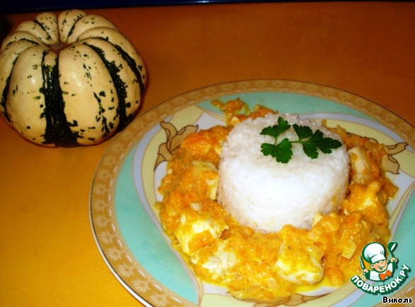 Такое мясо в тыквенном соусе можно подать к любому гарниру, но красивее всего смотрится с белым. Приятного аппетита!