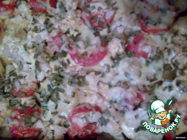 Поверх картофеля и капусты выложить кружочки помидоров.