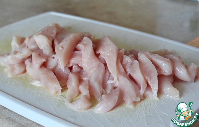 Куриное филе нарезать полосками. Затем смешать с крахмалом.