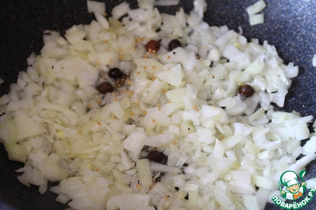 На сковороде разогреть 3 ст. л. растительного масла, выложить перец горошком и семена горчицы, обжаривать в течение 30 секунд. Затем добавить нарезанный лук и готовить на среднем огне 2-3 минуты. Лук должен быть золотистого цвета.