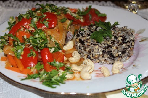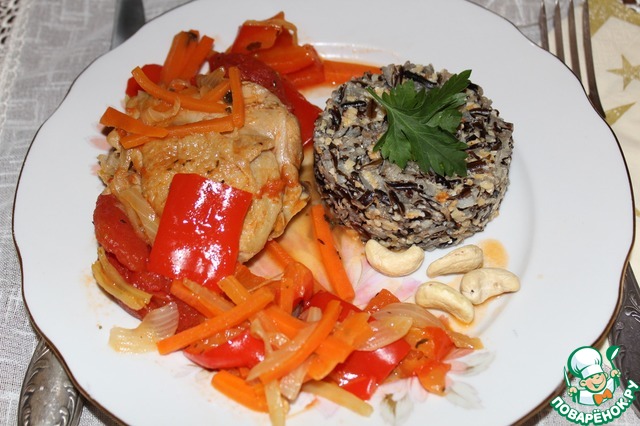 На тарелку выкладываем куриное бедро, овощи, поливаем небольшой порцией соуса, образовавшегося при готовке, сбоку гарнир из дикого риса с орехами.