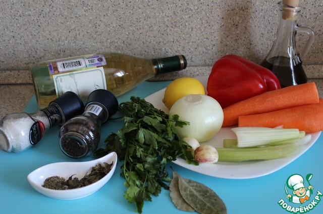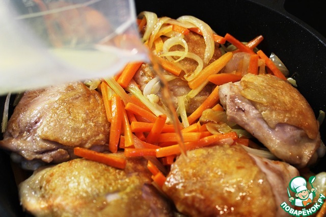 Возвращаем куски курицы в сковороду с луком, морковью и сельдереем, заливаем вино, доводим до кипения и даем выпариться спирту.