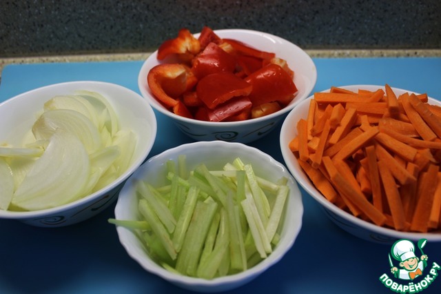 Лук нарезаем перьями, перец - крупными кусками, морковь и сельдерей разрезаем на куски по 4 - 5 см длиной, и нарезаем крупной соломкой.