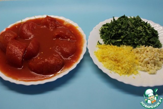 Если томаты в собственном соку крупные, то разрезаем их на две-три части. Зелень петрушки измельчаем, с лимона снимаем цедру, чеснок - мелкими кубиками.