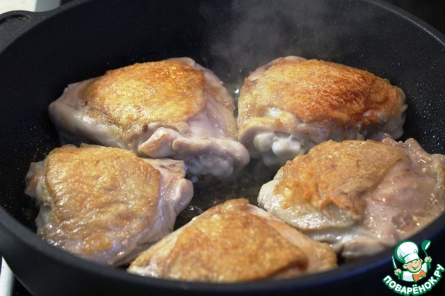 В сковороде с толстым дном разогреваем пару ложек растительного масла и обжариваем куриные бедрышки с двух сторон до румянца (бедрышки предварительно посолить). После обжарки перекладываем их в миску.