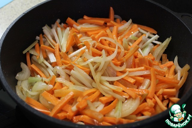 Добавляем морковь и сельдерей и продолжаем обжаривать еще 5 - 7 минут, до мягкости.