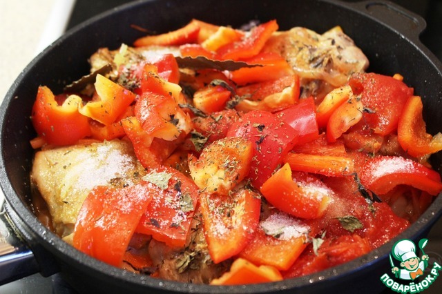 Затем добавляем томаты, крупно нарезанный перец, тимьян, базилик, лавровый лист, сахар (чтобы томаты раскрыли свой вкус и не кислили), соль по вкусу. Накрываем крышкой и тушим 35 - 30 минут, когда тушение закончено, удаляем лавровый лист.