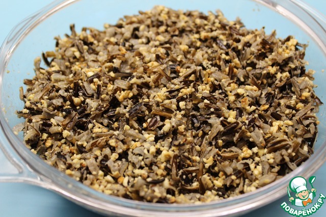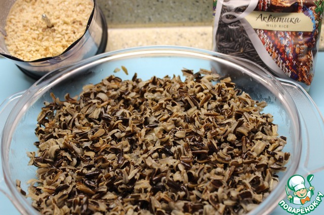 Дикий рис промываем и отвариваем (лучше начать этот процесс одновременно с началом приготовления курицы) согласно инструкции на упаковке, орехи обжариваем в микроволновке и измельчаем, но не до муки.