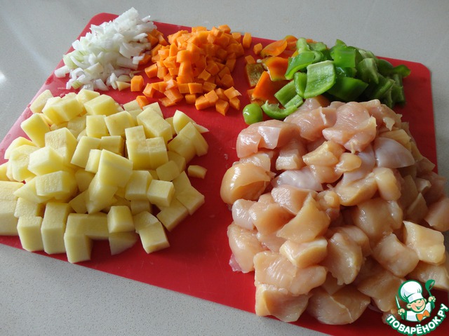 Сначала нарезаем курицу кусочками, картофель, морковь и перец - кубиками. Лук и чеснок порежем мелко.