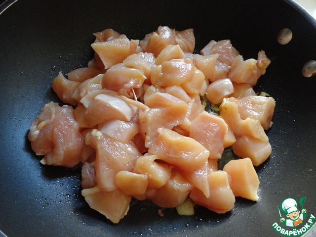 Выкладываем в вок к луку курицу. Перемешиваем.