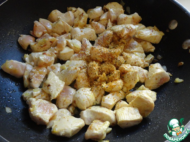 Когда курица слегка обжарится, солим, добавляем специи и часть карри.