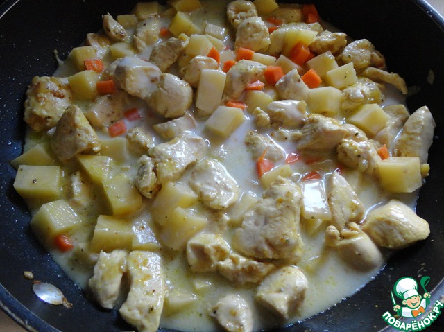 Накрываем крышкой, ставим на небольшой огонь и тушим примерно минут 15 (до готовности картофеля).