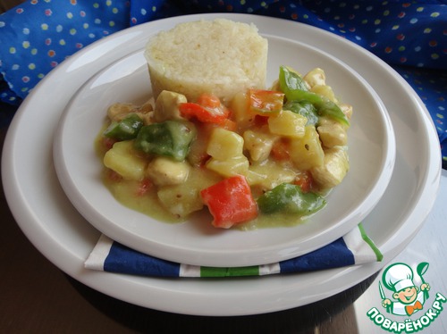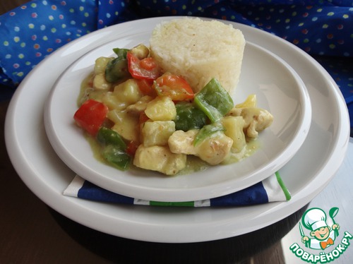 | Хочу поделиться с вами очень простым, вкусным, пряным блюдом. Это нежное куриное филе в соусе из кокосового молока с добавлением карри и овощей. Идеальное сочетание вкусов. Подается с рисом. |