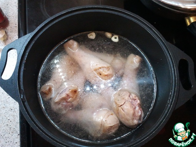 Ножом делаем надрезы и кладем туда чеснок предварительно нарезанный (2 зубчика хватит), далее помещаем все в кастрюлю, вода должна покрывать курицу и варим минимум 50 мин. В это время будет чем заняться!