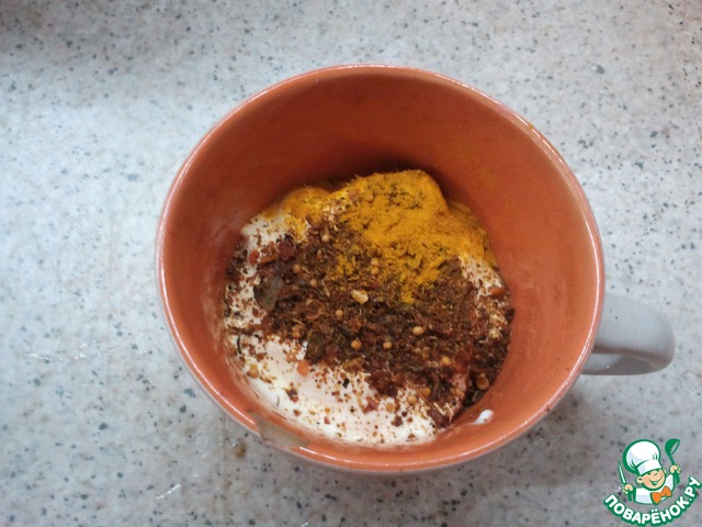 Берем 4-6 ст. л. сметаны, 1 ч. л. куркумы 1 ч. л. черного молотого перца и перемешиваем с приправой я брал для мяса, (аромат не передоваемый) мне брат из Ставрополя привёз, Можно купить на всех рынках, там где приправы в россыпь продают (Кавказ, Азия и т. д)