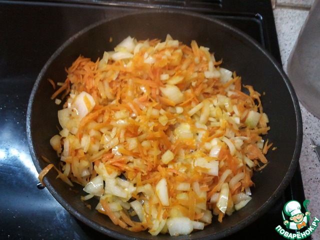 Режим лук мелкими кубиками, морковку натираем на крупной терке и обжариваем, солим в середине готовности (когда объем уменьшится в два раза, что-бы лук и морковь сок отдали)