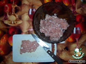 Нарезать куриное филе на маленькие кубики.