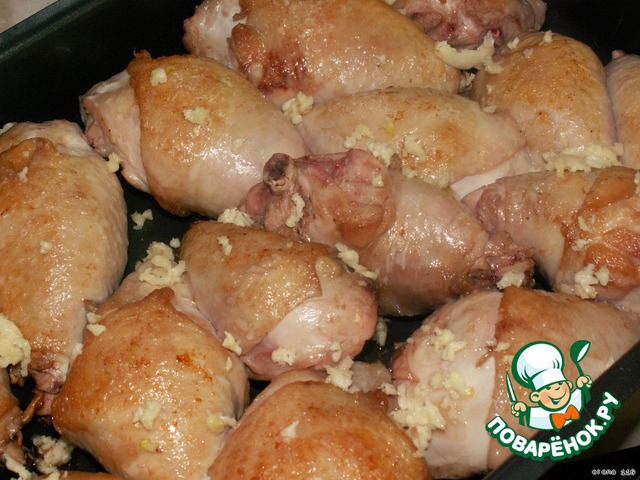 Сложить курицу в форму. Посыпать курицу пропущенным через пресс чесноком.
