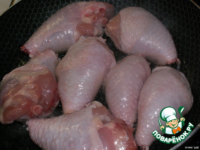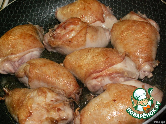 Куриные голени помыть, обсушить, посолить и обжарить с двух сторон до золотистой корочки на растительном масле (не до готовности).
