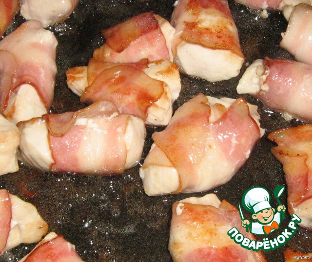 Грудку нарезать крупными кубиками, бекон пополам.