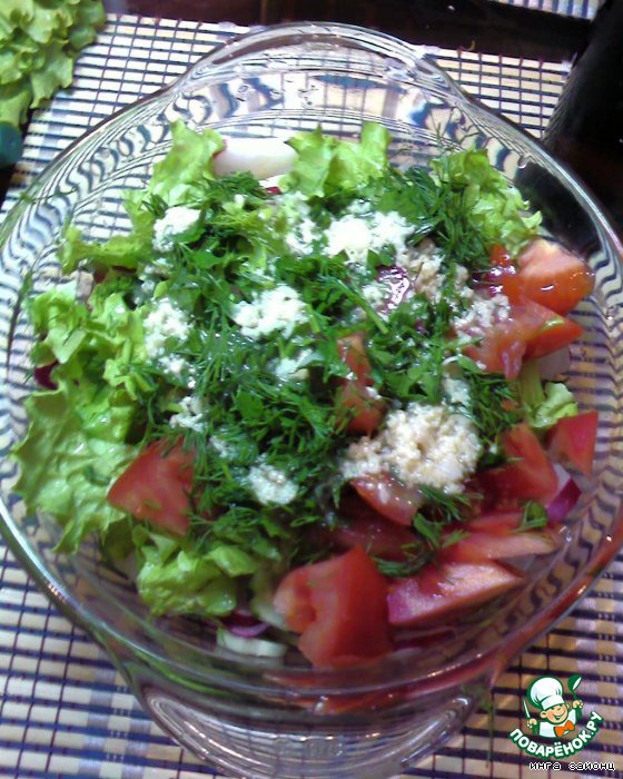 Все тщательно взбить (моя подруга смешивает в баночке из под детского питания) и заправить салатик. Очень вкусно!