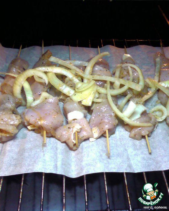 Нанизать на шпажку кусочки курочки так, чтобы они слегка касались друг друга. На решетку положить кусок бумаги для выпечки, на нее уложить шашлычки.